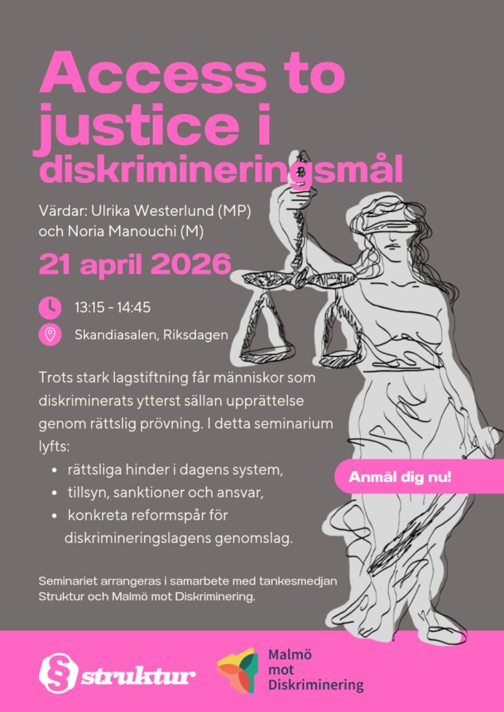 Tankesmedjan Struktur och Malmö mot Diskriminering arrangerar seminariet. Riksdagsledamöterna Ulrika Westerlund (MP) och Noria Manouchi (M) är värdar. Seminariet hålls i Skandiasalen mellan 13:15 och 14:45. På agendan finns rättsliga hinder i dagens system, tillsyn och ansvar samt förslag på reformer för att stärka diskrimineringslagens genomslag.