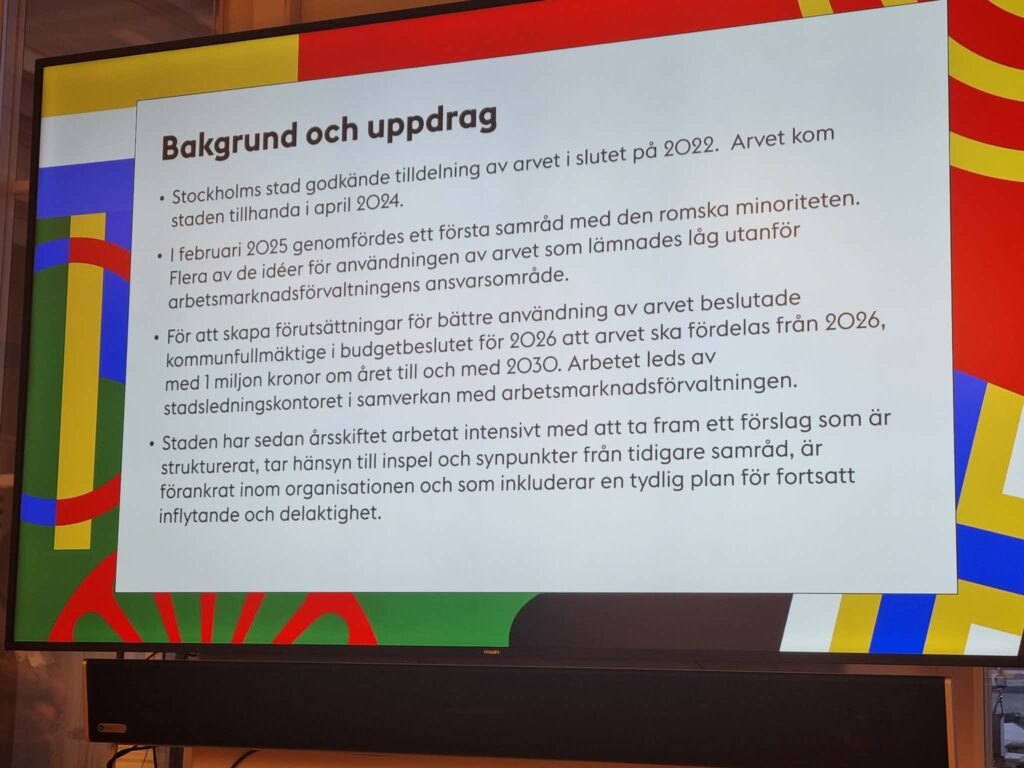 Under mötet informerades vi även om att Stockholms stad planerar att dela ut pengarna under en femårsperiod, med ett samråd varje år i november. De kommer att fatta beslut om första utdelningen av arvet den 18 juni i år. Det meddelades också att det kommer att hållas fler öppna samråd för romer framöver, vilket ger en fantastisk möjlighet för det romska folket att fortsätta vara delaktiga och påverka centrala frågor rörande deras rättigheter och inkludering.