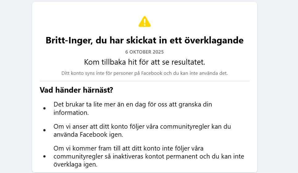 Så jag har blivit avstängd från Facebook, och naturligtvis har jag överklagat detta. Det kändes som ett svek, än en gång. Vad var den utlösande faktorn den här gången? Jag är helt övertygad om att det handlar om att jag har blivit anmäld för att ha delat något som någon uppfattade som olämpligt. Men vad kan det ha varit?